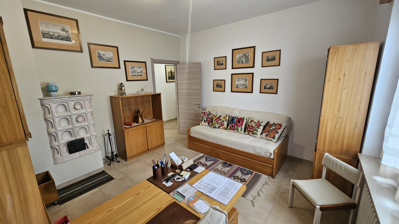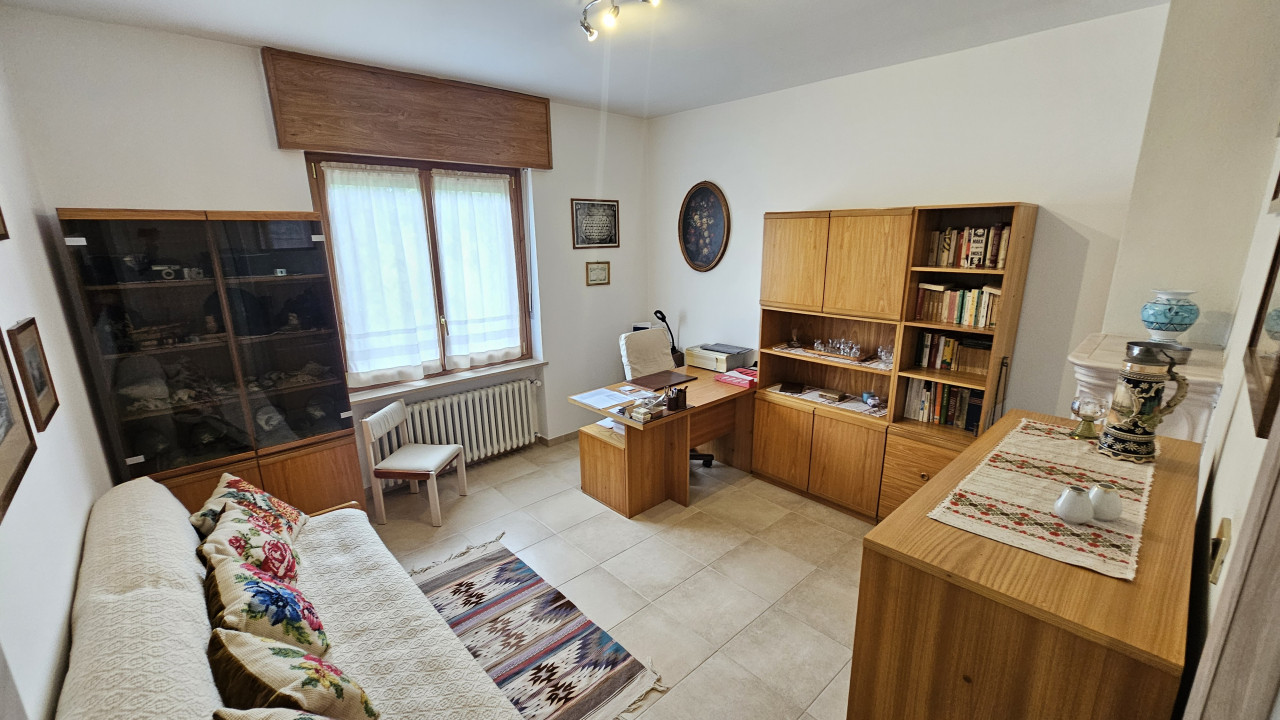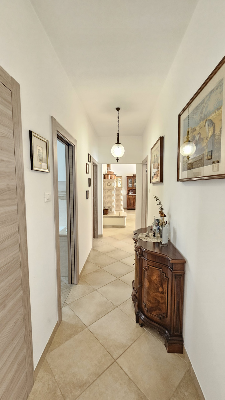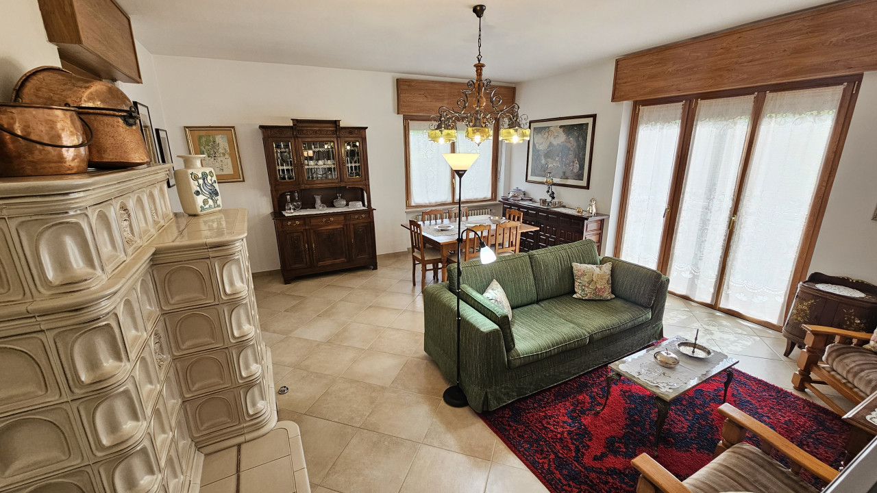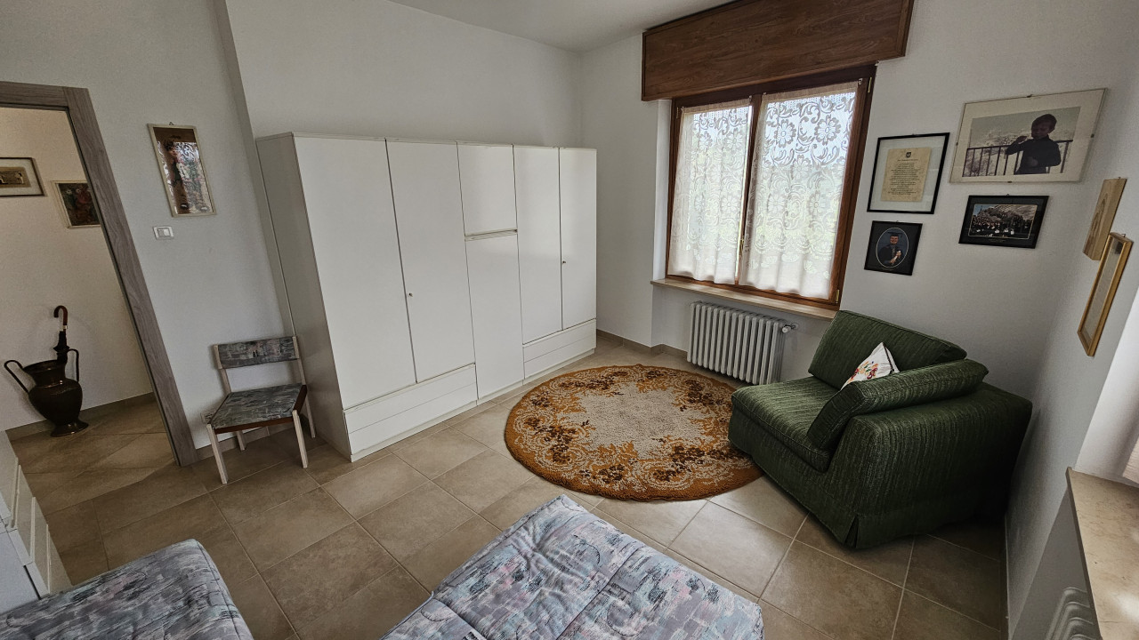 Dal cortile cintato si entra con la scala esterna o con quella nel mezzo del fabbricato al piano primo composto dal corridoio che fa accedere alle tre camere, cucina abitabile, salone con stufa a olle in maiolica, lungo balcone sul fronte e terrazzo sul retro, servizio con vasca, ripostiglio.