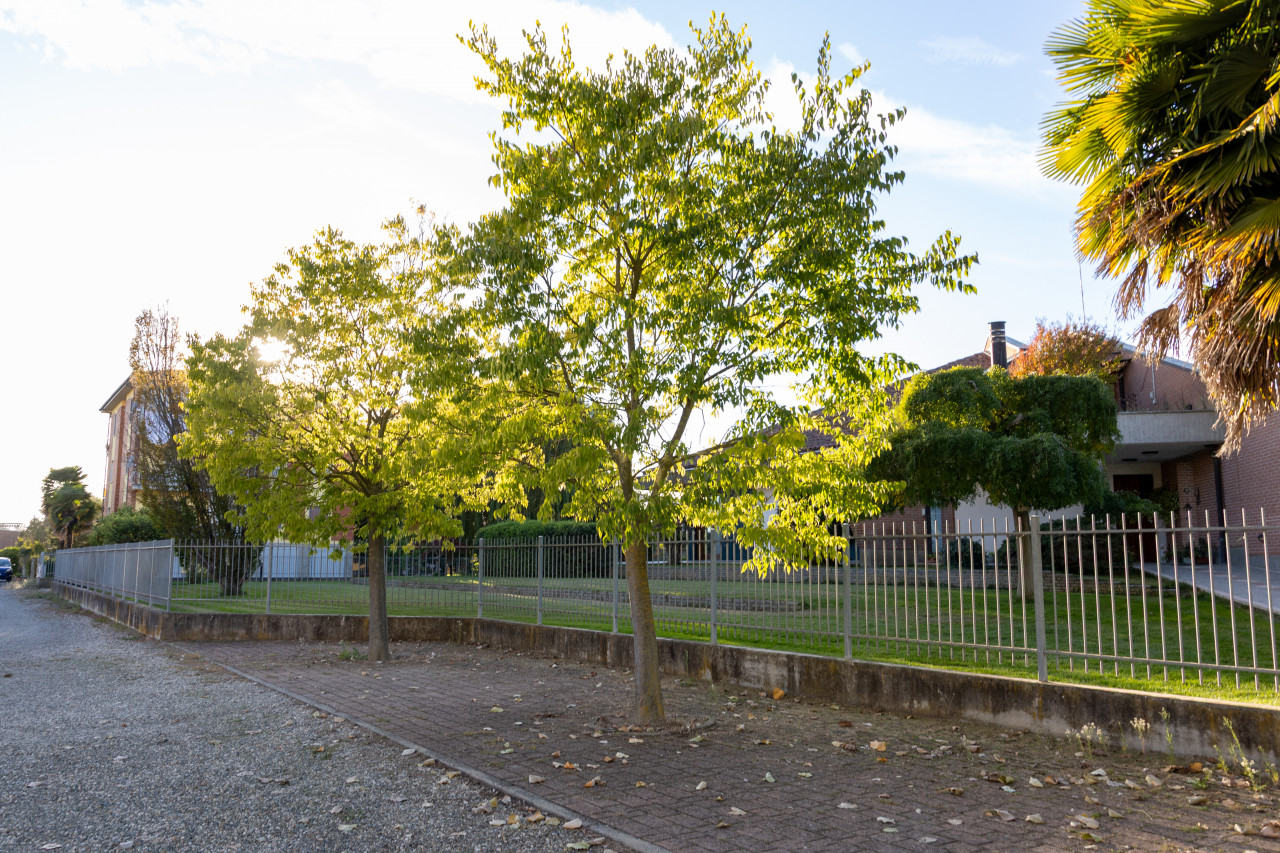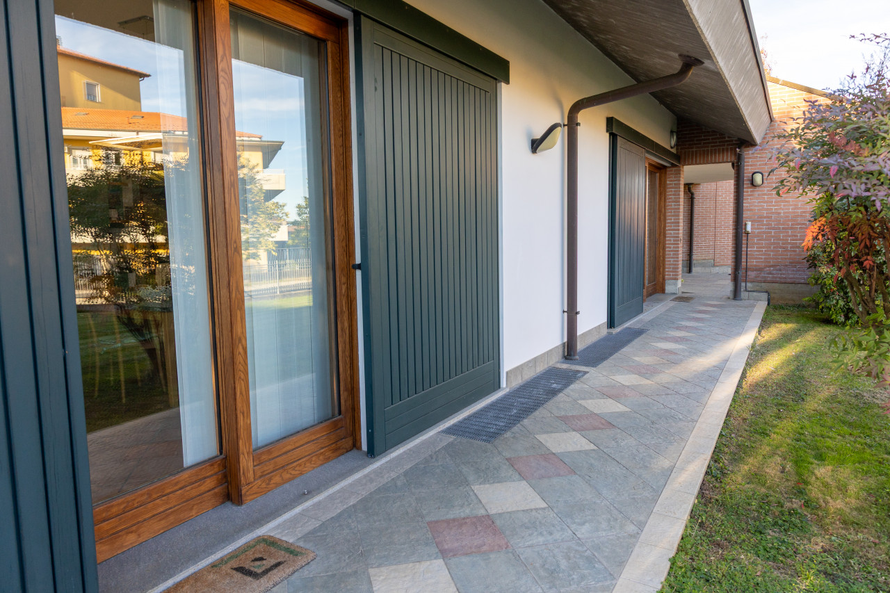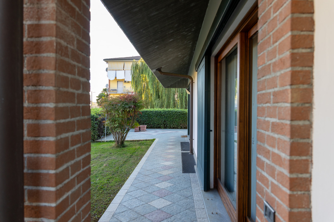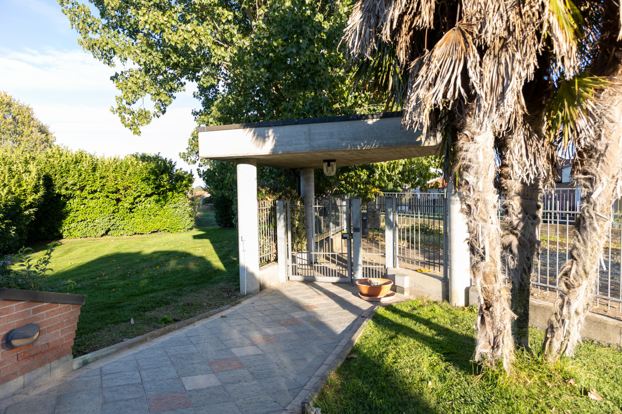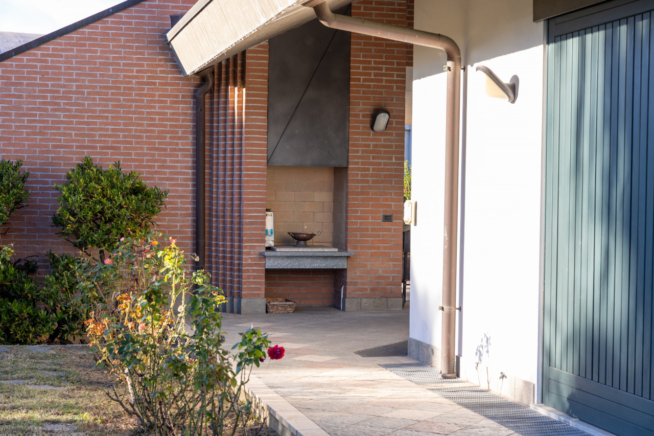 Muri esterni in mattoni paramano, percorso autovetture e cortile in autobloccanti, rampa per la discesa nel seminterrato riscaldabile per evitare il ghiaccio nel periodo invernale così da rendere sicuro l'accesso anche nella fredda stagione. Tutto il seminterrato è protetto da una intercapedine che evita l'umidità di risalita in casa. Cancello su strada e portone del seminterrato automatizzati.