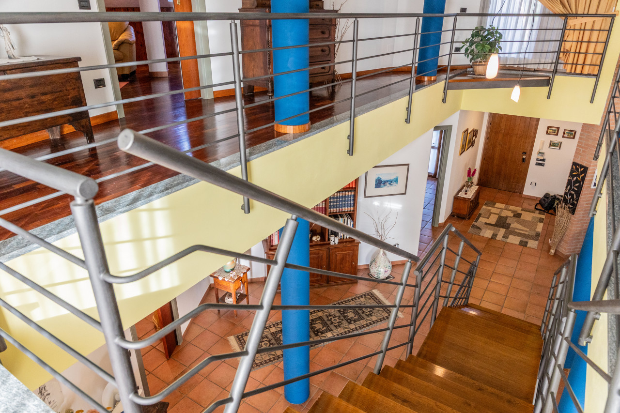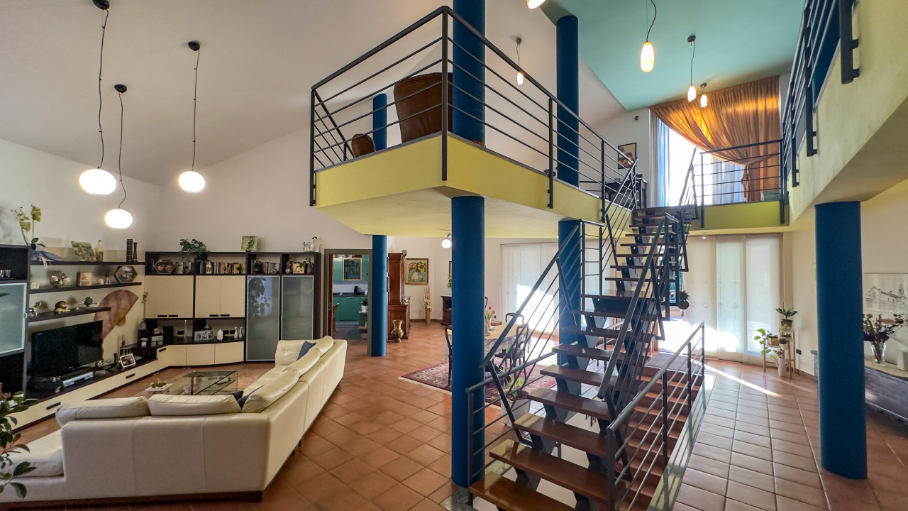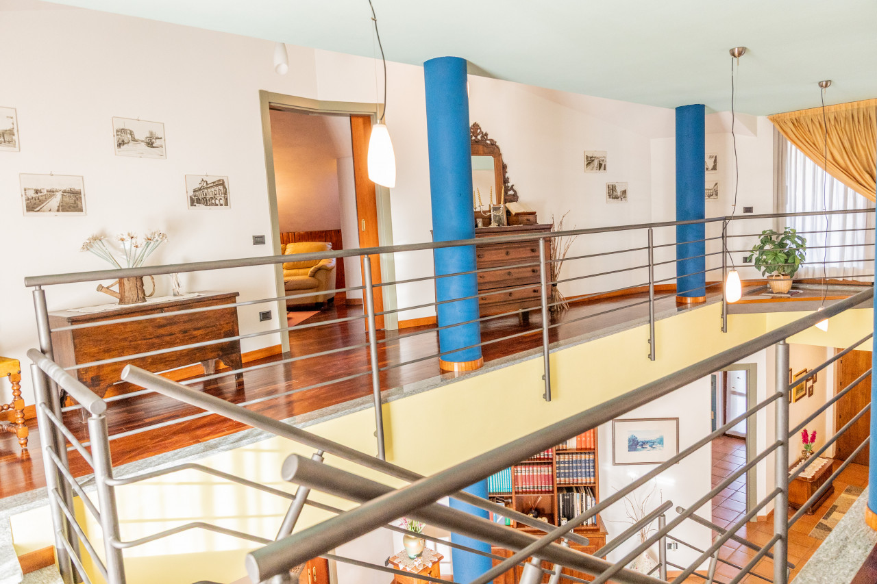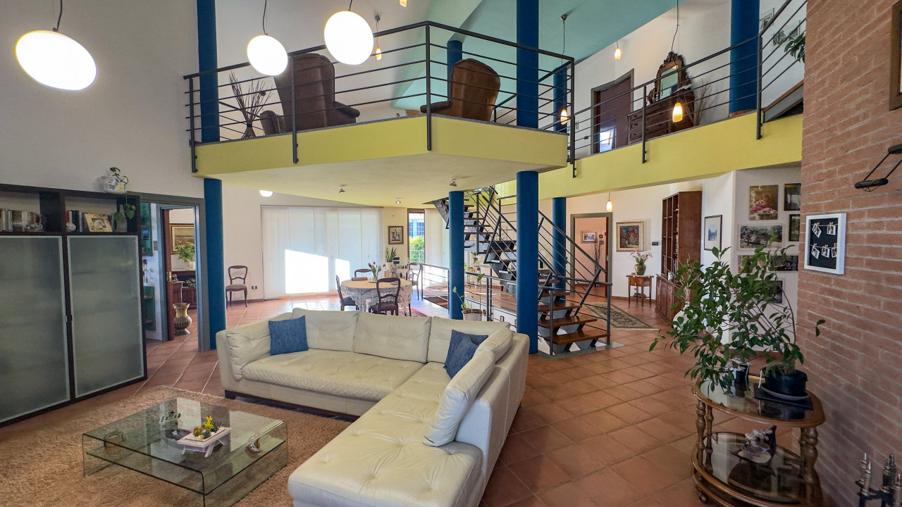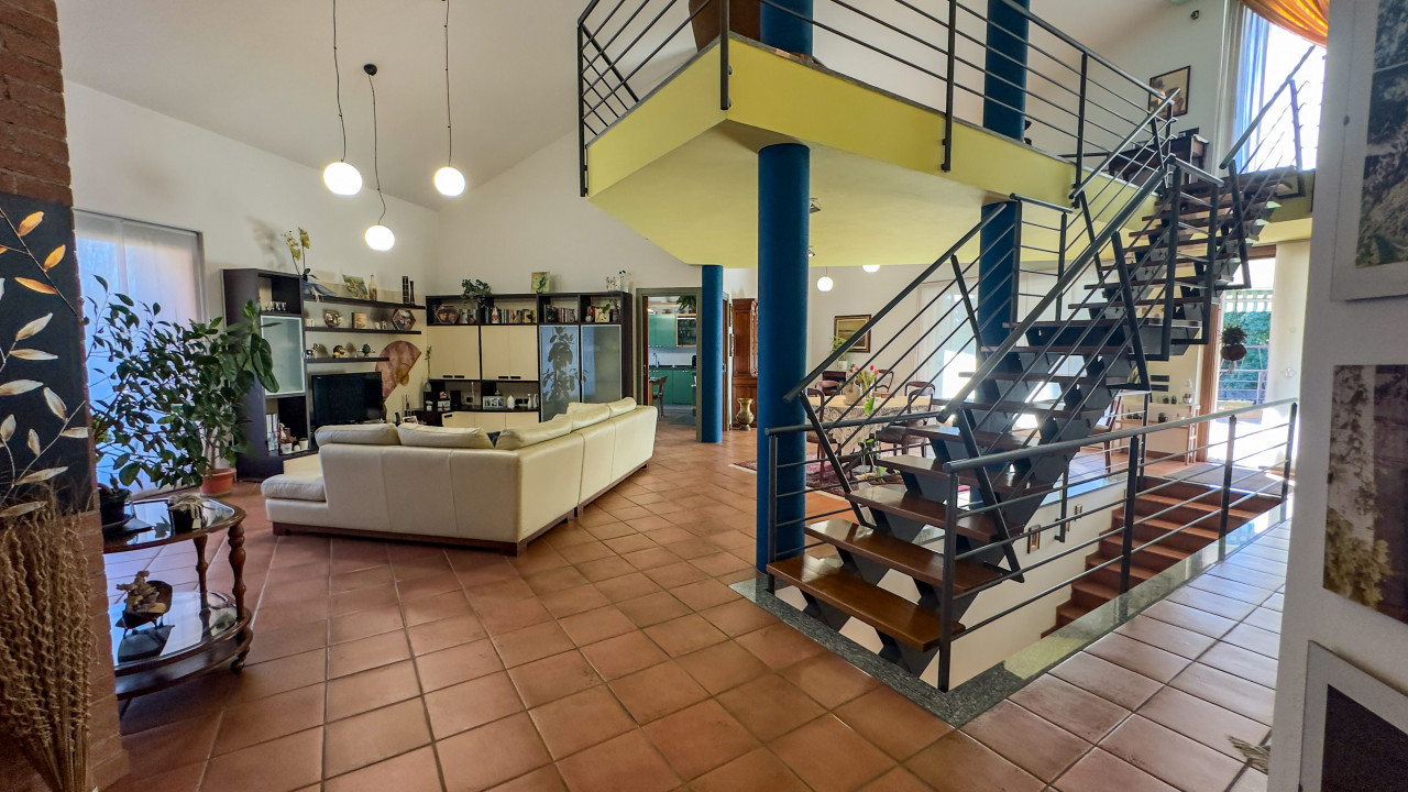 Si accede dall'ingresso sull'ampio ed alto doppio salone dotato di camino rivestito in marmo su parete di mattoni con faccia a vista e zona pranzo conviviale dal quale uscire sul terrazzo con tende da sole, cucina abitabile, disimpegno verso la zona notte con tre spaziose camere, bagno con vasca e servizio con doccia. Vicina all'ingresso la comoda lavanderia. Centralmente la scala a vista con mancorrenti in ferro conduce al piano primo dove a soppalco troviamo il secondo salotto, lateralmente la quarta stanza mansardata da adibire a studio o quarta camera con annesso terzo servizio pronto per esser arredato, grande terrazzo sul retro sopra a quello del pianto terra e terrazzino sul fronte.