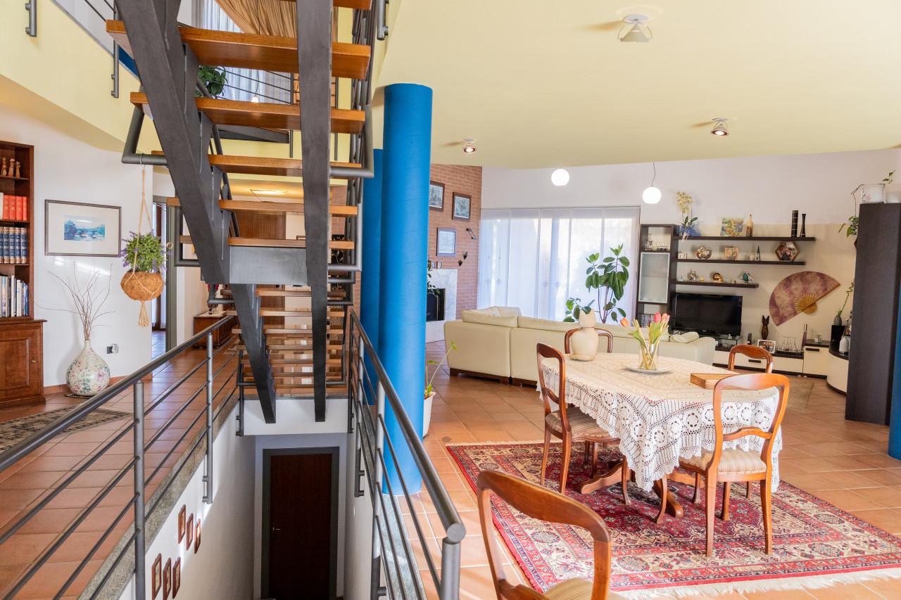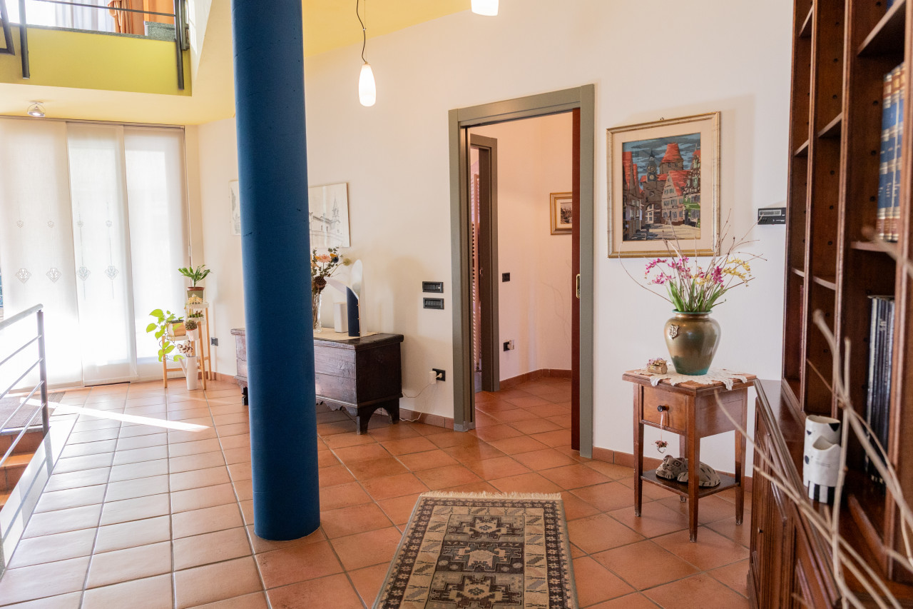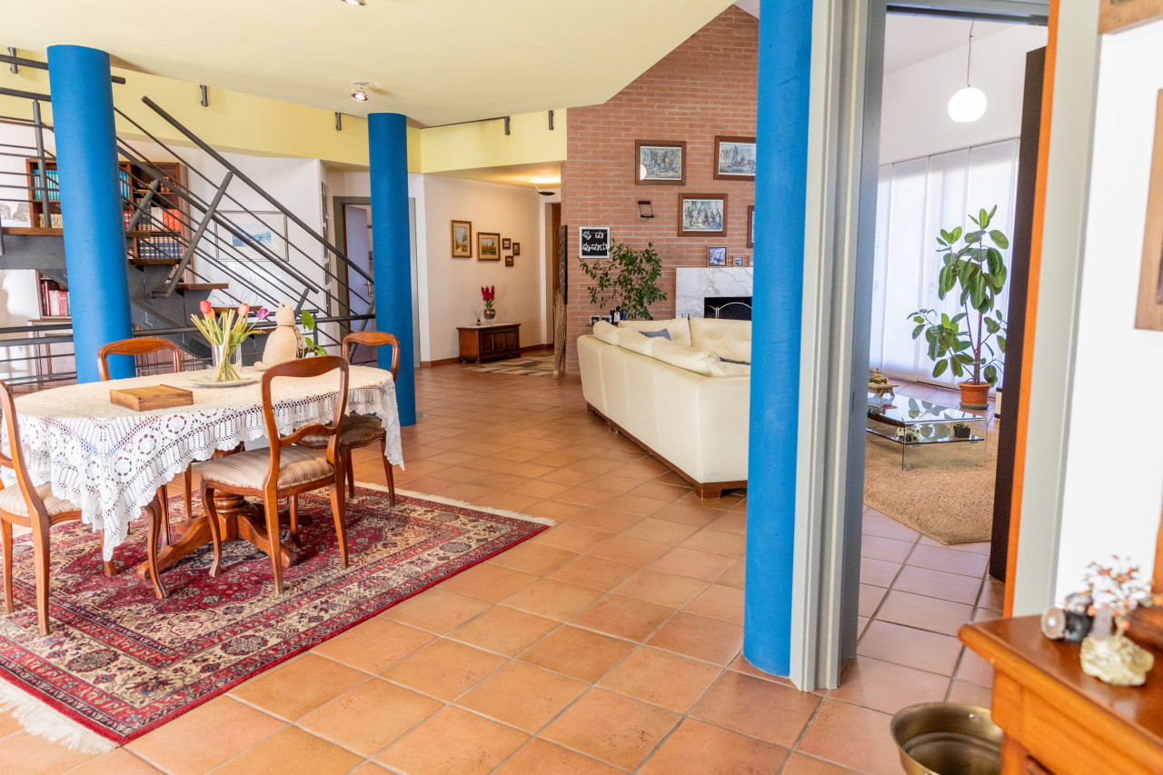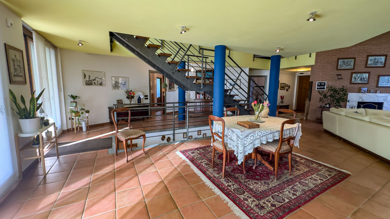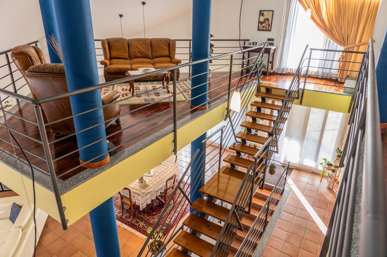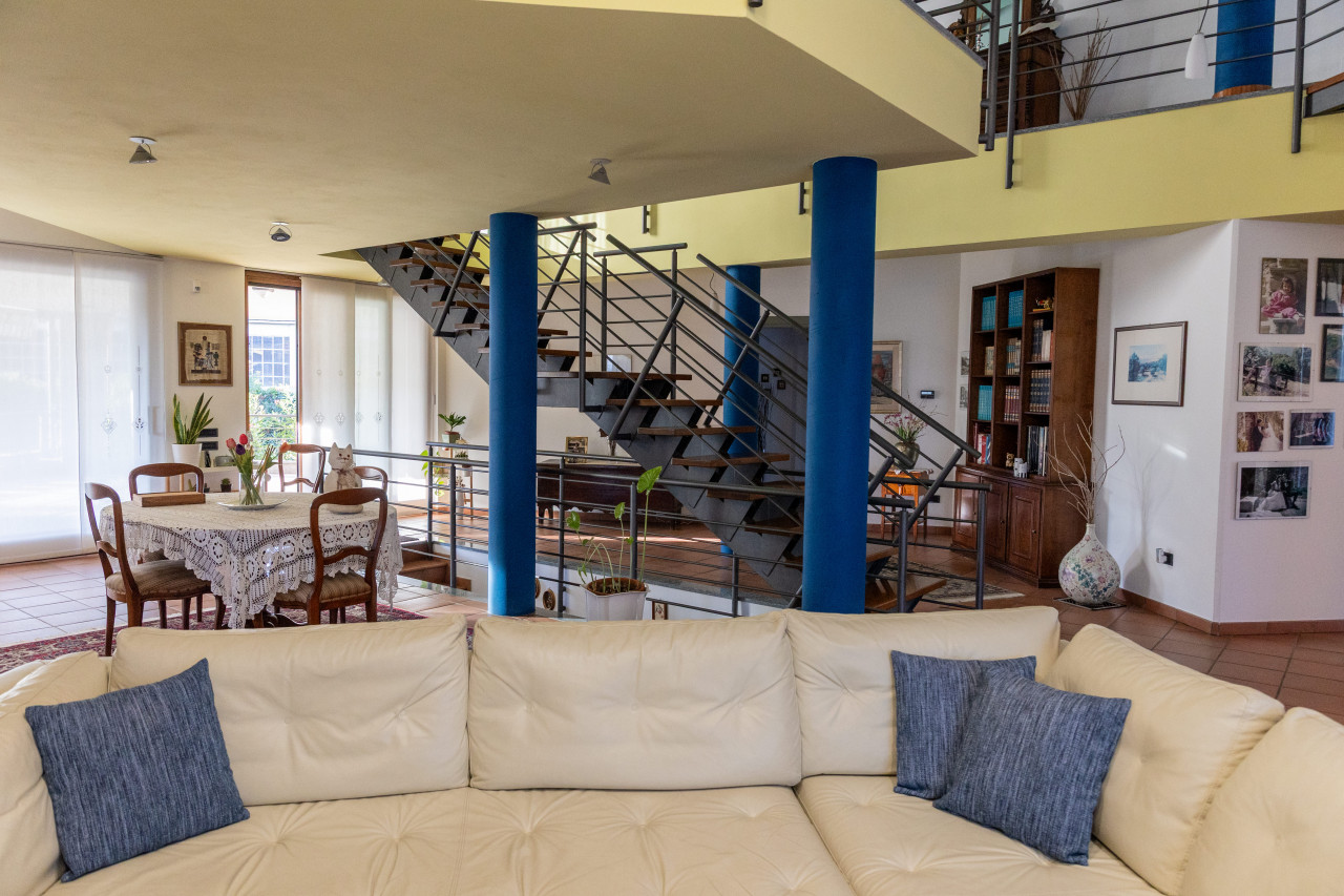 Si accede dall'ingresso sull'ampio ed alto doppio salone dotato di camino rivestito in marmo su parete di mattoni con faccia a vista e zona pranzo conviviale dal quale uscire sul terrazzo con tende da sole, cucina abitabile, disimpegno verso la zona notte con tre spaziose camere, bagno con vasca e servizio con doccia. Vicina all'ingresso la comoda lavanderia. Centralmente la scala a vista con mancorrenti in ferro conduce al piano primo dove a soppalco troviamo il secondo salotto, lateralmente la quarta stanza mansardata da adibire a studio o quarta camera con annesso terzo servizio pronto per esser arredato, grande terrazzo sul retro sopra a quello del pianto terra e terrazzino sul fronte.