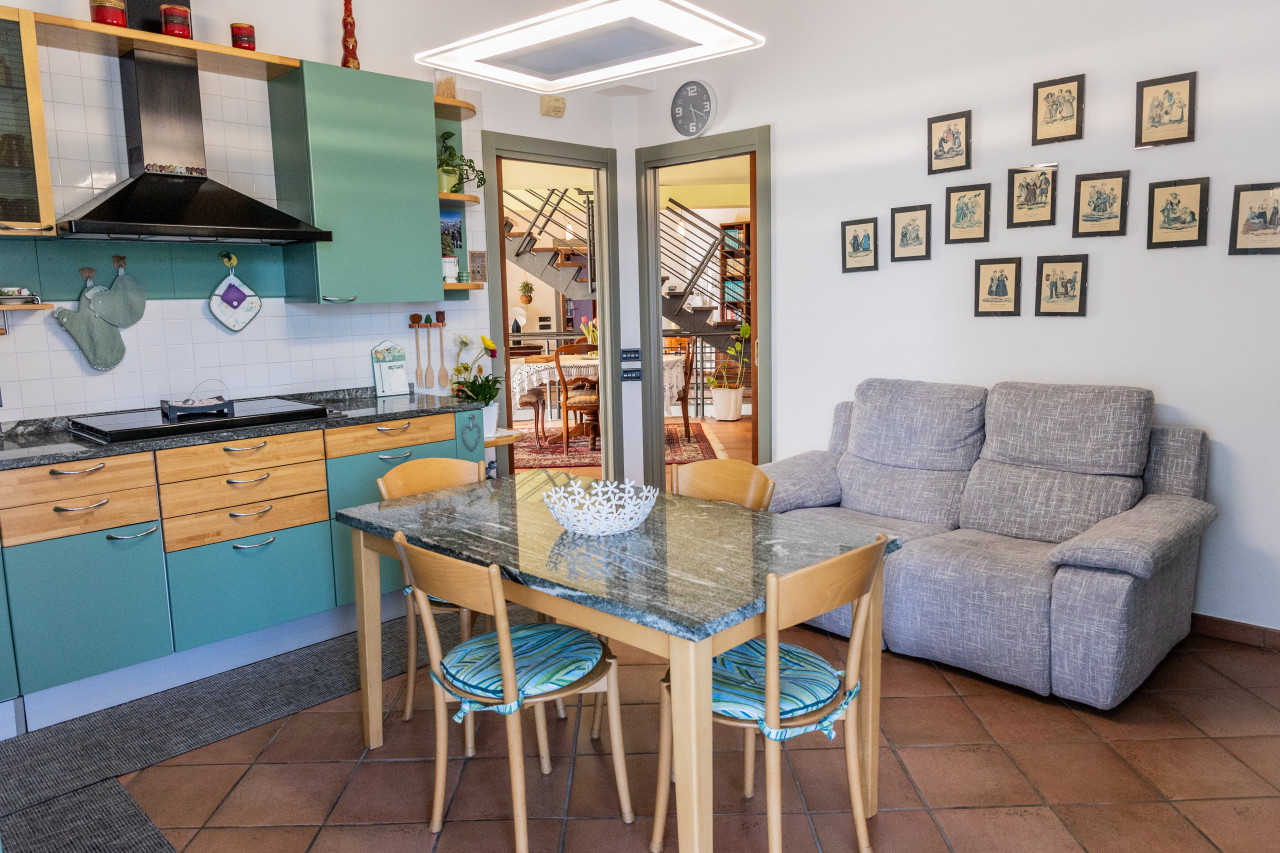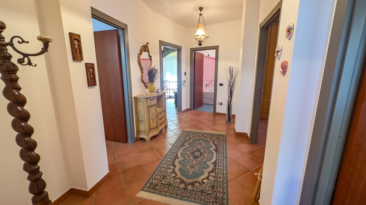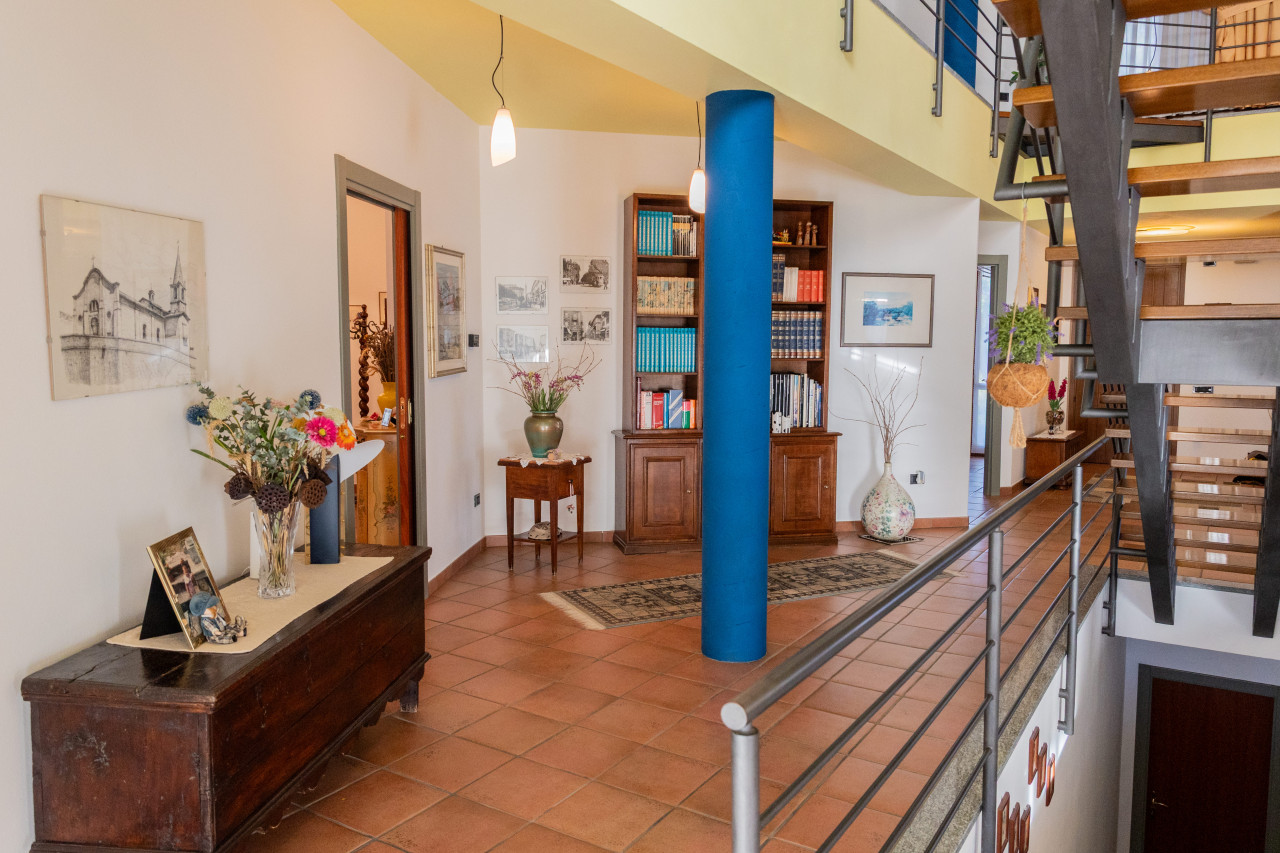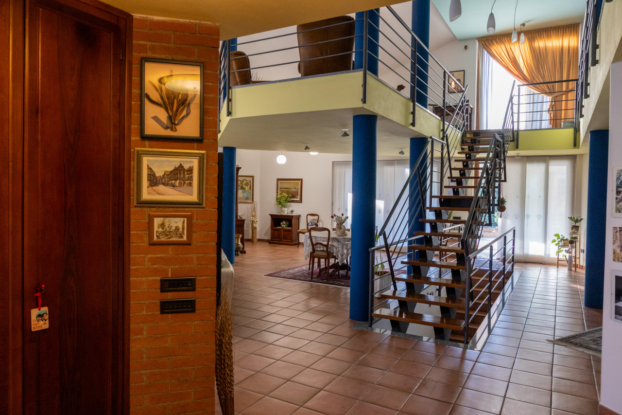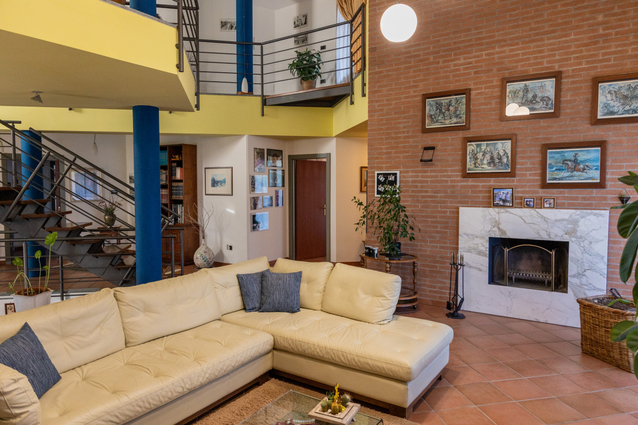 Si accede dall'ingresso sull'ampio ed alto doppio salone dotato di camino rivestito in marmo su parete di mattoni con faccia a vista e zona pranzo conviviale dal quale uscire sul terrazzo con tende da sole, cucina abitabile, disimpegno verso la zona notte con tre spaziose camere, bagno con vasca e servizio con doccia. Vicina all'ingresso la comoda lavanderia. Centralmente la scala a vista con mancorrenti in ferro conduce al piano primo dove a soppalco troviamo il secondo salotto, lateralmente la quarta stanza mansardata da adibire a studio o quarta camera con annesso terzo servizio pronto per esser arredato, grande terrazzo sul retro sopra a quello del pianto terra e terrazzino sul fronte.